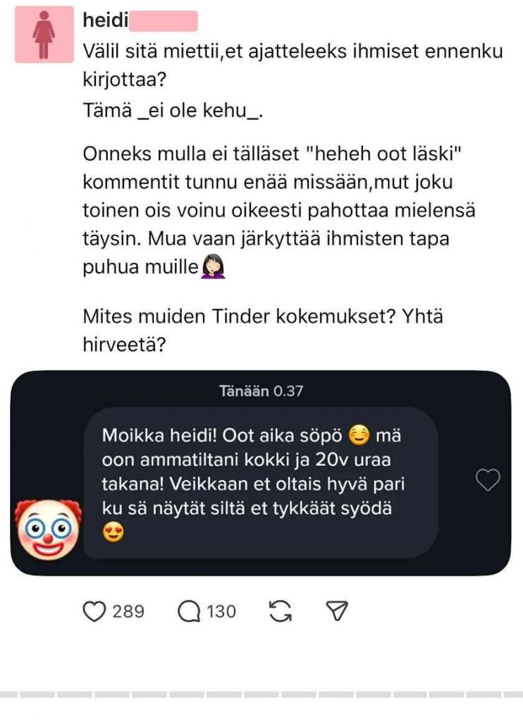 - Feissarimokat: Heidi saa Tinderissä karmean ehkä kohteliaisuudeksi tarkoitetun viestin