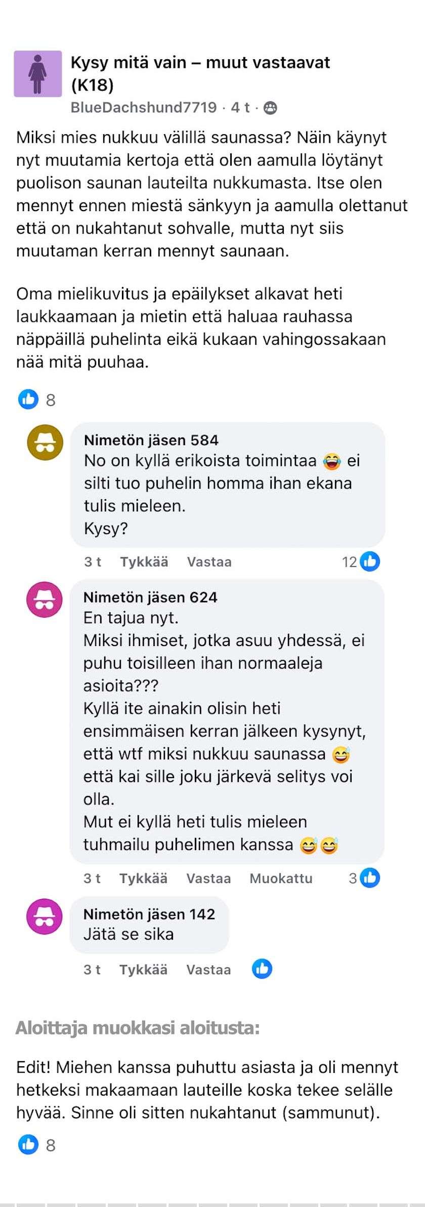 Joku haluaa kysyä muilta, miksi hänen miehensä nukkuu välillä saunassa.