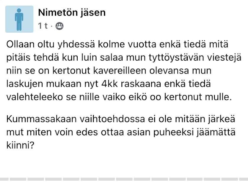 Jos mies on saanut tietää näinkin tärkeän asian vain siten, että lukee sen salaa naisensa puhelimesta.