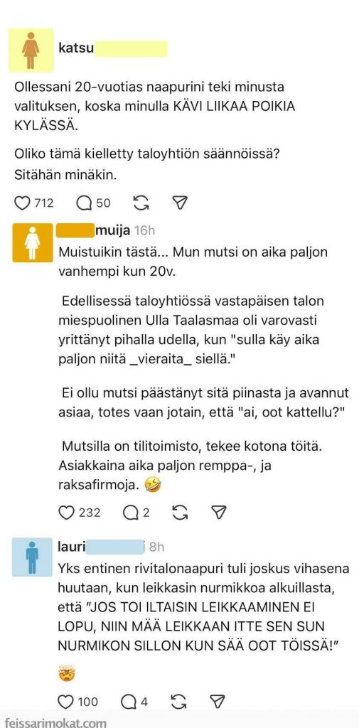 – Joskus tapasin vanhan mummon, joka päivitteli sitä, kuinka hänen naapurissaan asuvan kolmen naisen luona käy liikaa miehiä kylässä. Kävi kuulemma rappukäytävässä jopa uhittelemassa niille, ettei tänne ole heillä enää mitään asiaa. Ihan niin kuin se naapurille mitenkään kuuluisi, kuka toisen luona käy kylässä, kertoo joku oman kokemuksensa aiheesta.