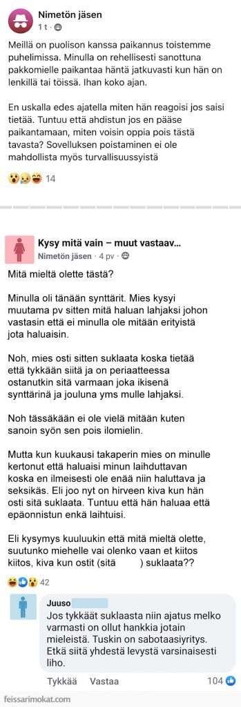 Tässä on myös toisen naisen paljastus, joka on ehkä aika vakava tapaus. Hän nimittäin seuraa miehensä liikkumista vähän liiankin tarkoin. Vaikka pari on sopinut, että he voivat paikantaa toistensa matkapuhelimien sijainnit, tuskin mies haluaa, että nainen paikantaa hänen kaikki sijaintinsa ja tekee sitä koko ajan.
