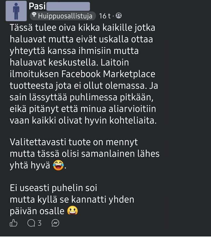 Hän kertoo sen toimivan heille, jotka haluaisivat keskustella, mutta eivät uskalla ottaa muihin yhteyttä.